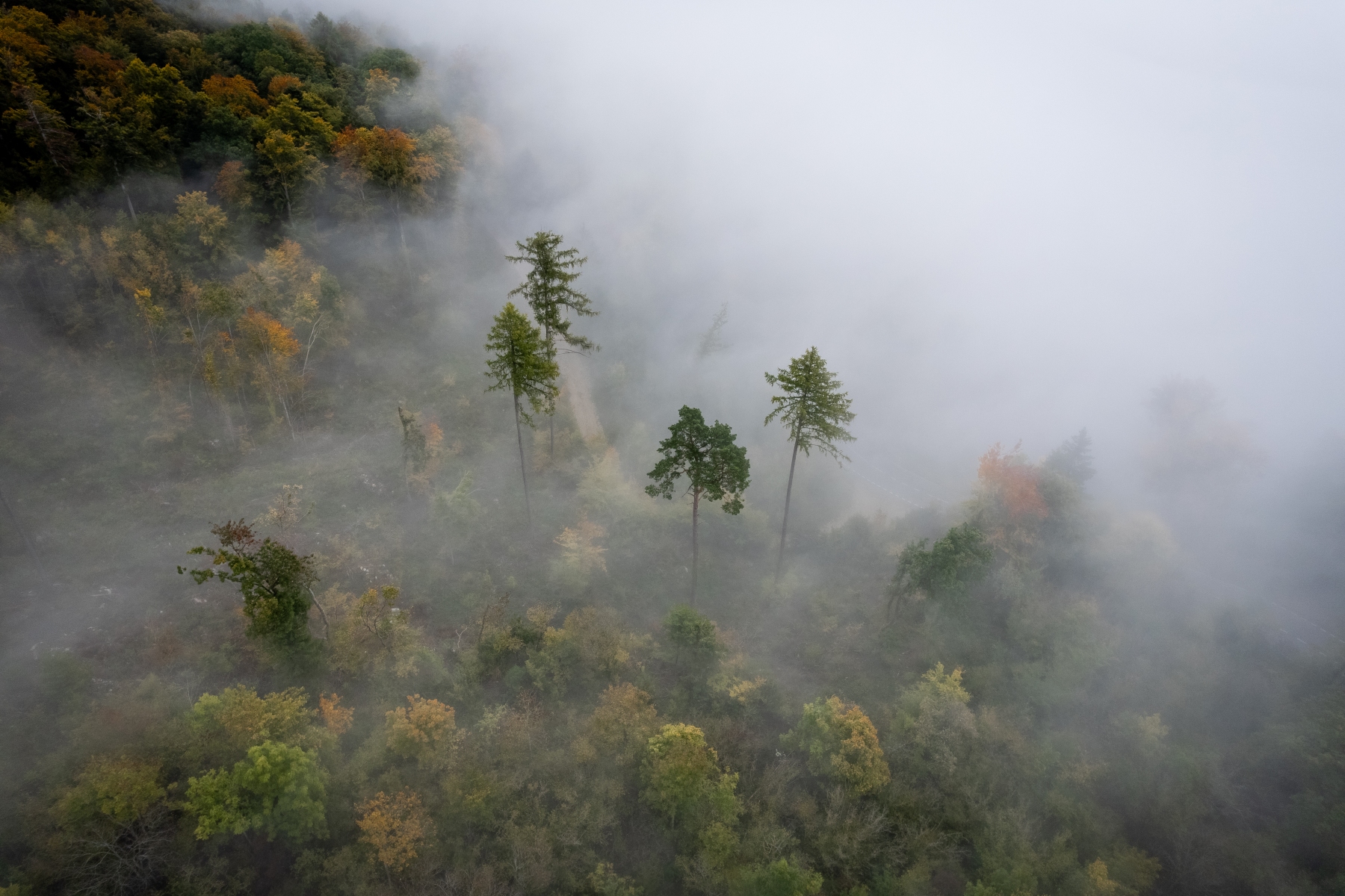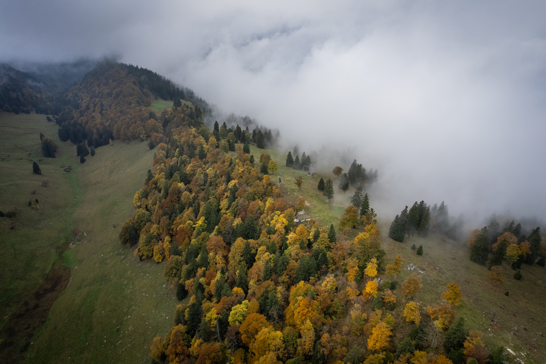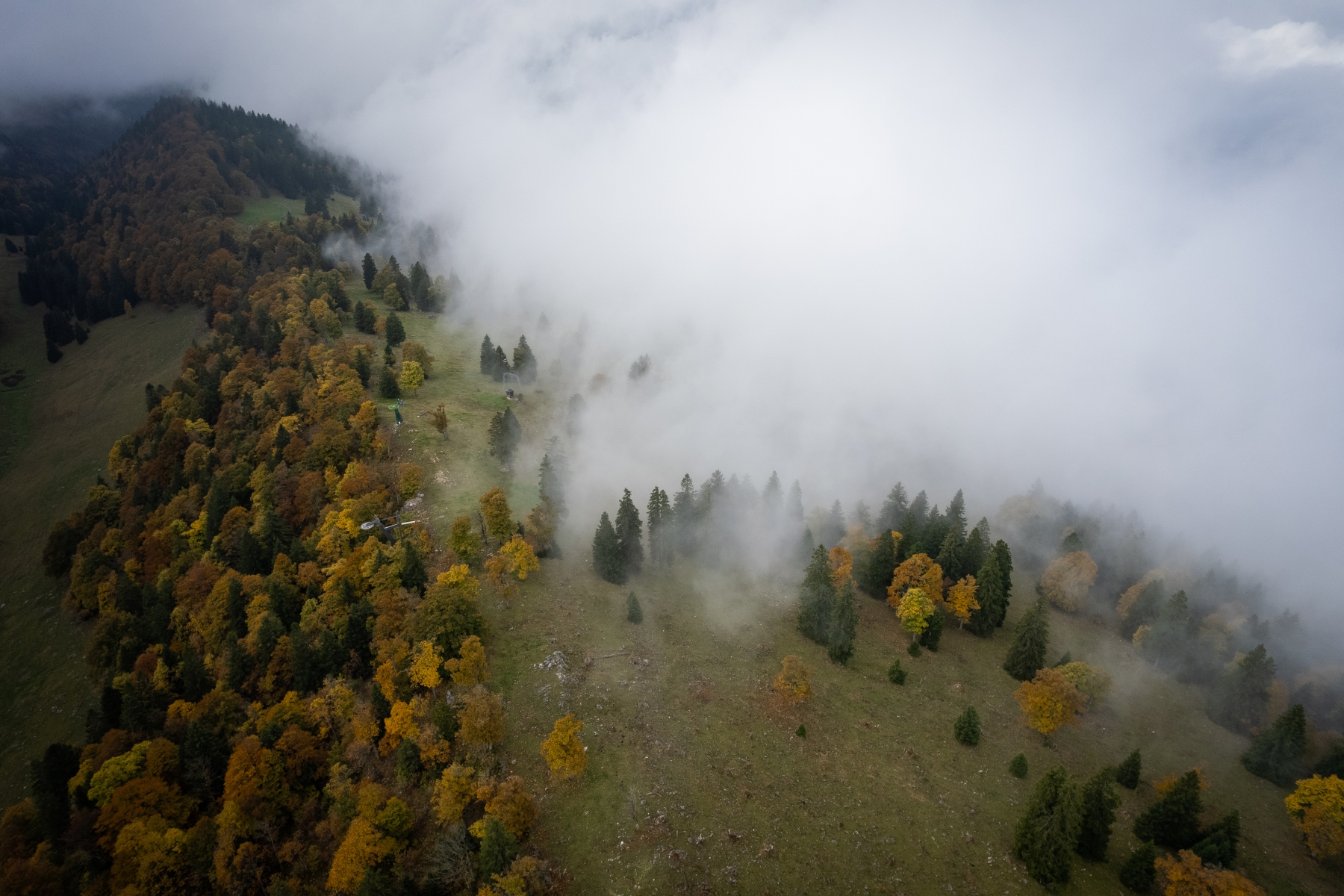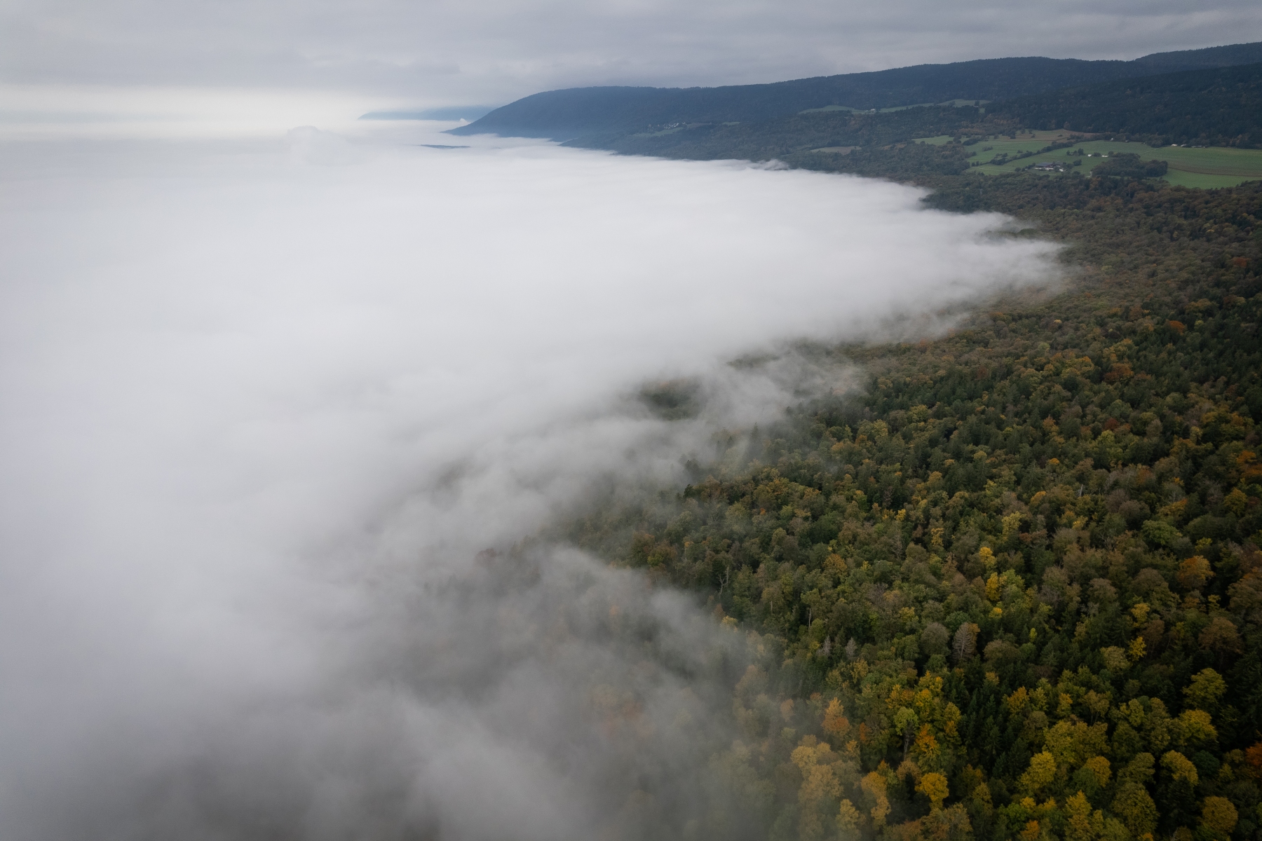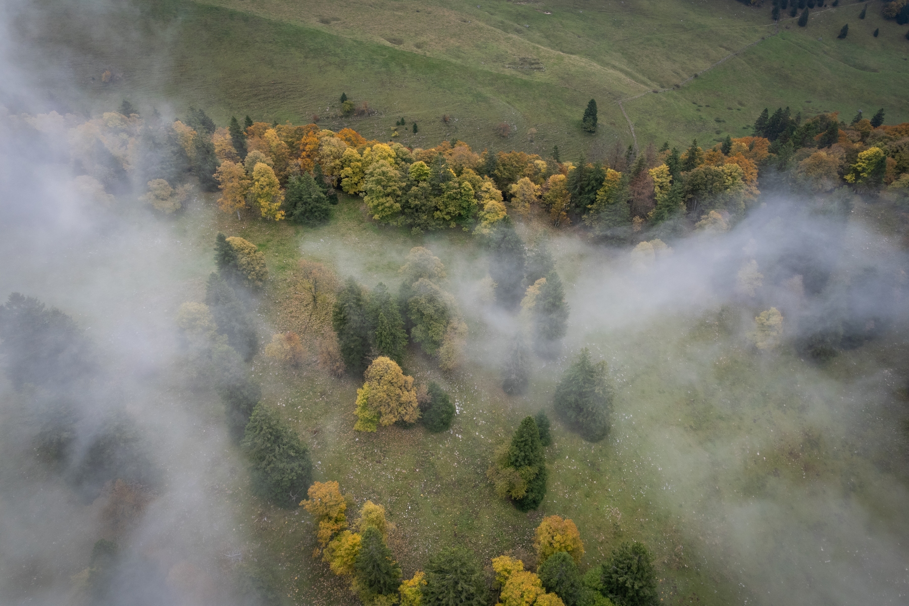 Jeudi matin le 09.10.2025, départ pour la région du parc du Chasseral pour essayer de sortir du brouillard de la Broye, et prendre les couleurs automnales