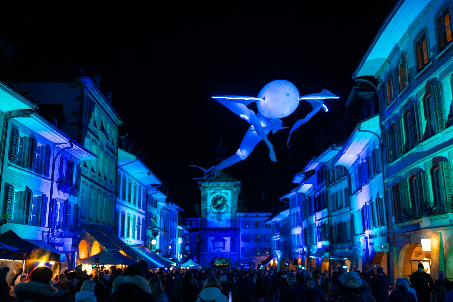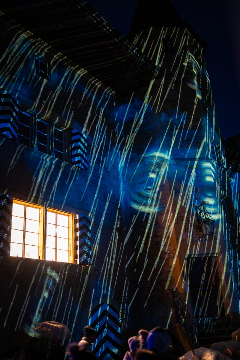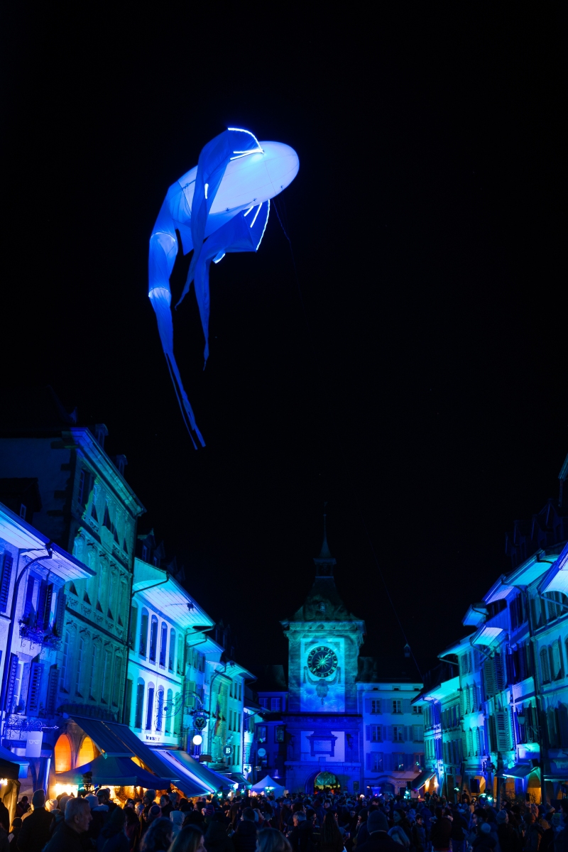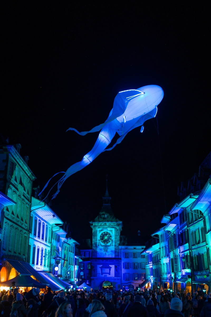 Promenade au 10ème festival des lumières de Morat. Pour cette éditon retour des baleines volantes dans la rue centrale et comme chaque année une nouvelle projection sur l’école Berntor.