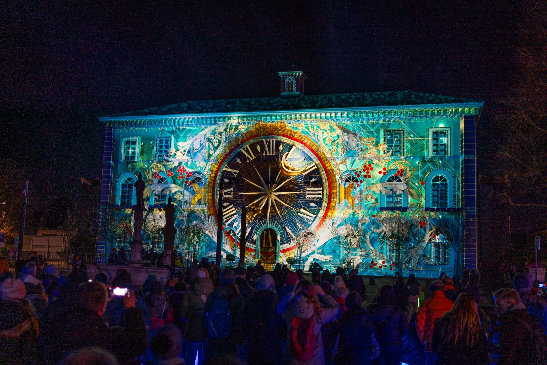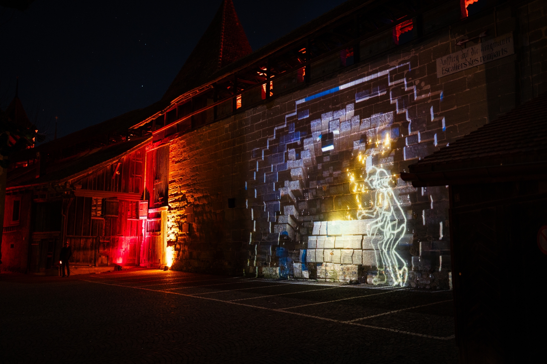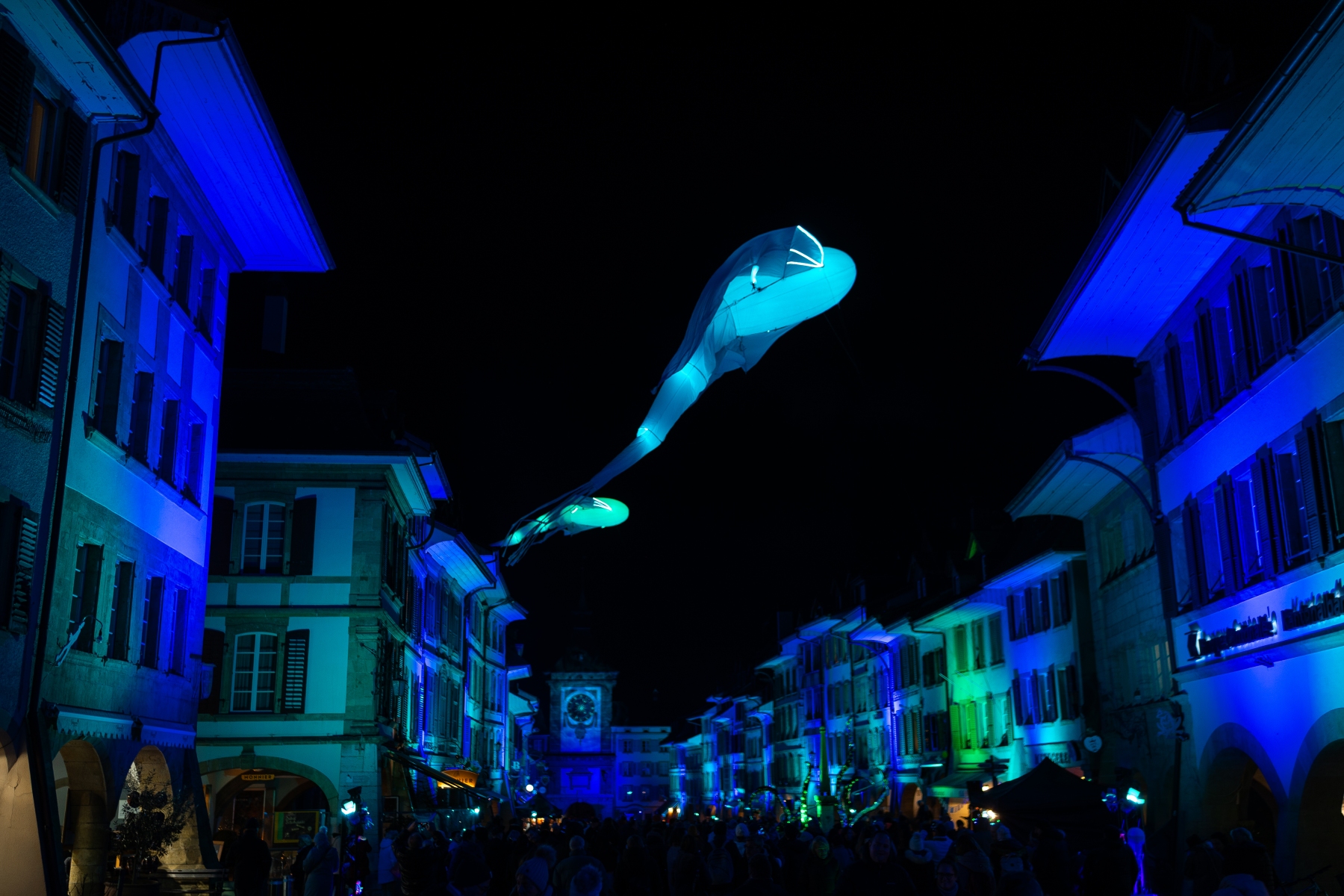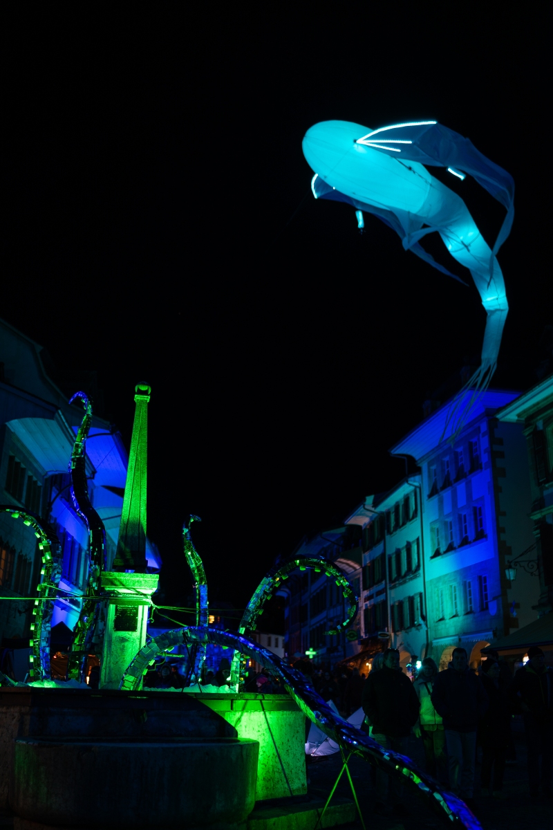 Promenade au 10ème festival des lumières de Morat. Pour cette éditon retour des baleines volantes dans la rue centrale et comme chaque année une nouvelle projection sur l’école Berntor.